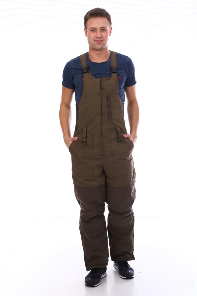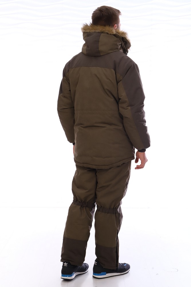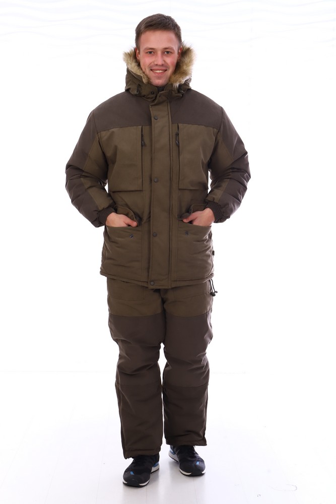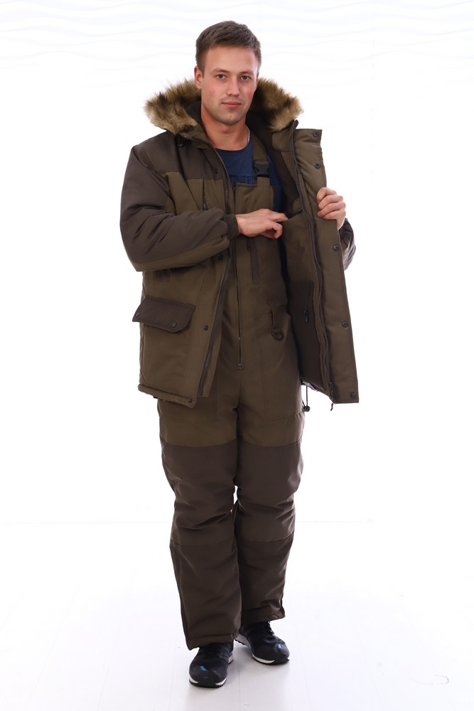 Костюм из комбинированной ткани, состоящий из куртки и полукомбинезона. Модель разработана для активного отдыха, охоты и рыбалки.